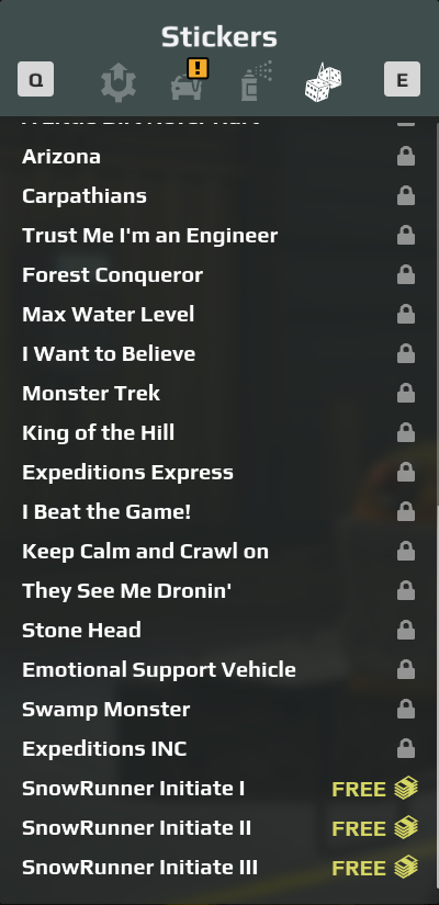 - For stickers, choose the truck you want to customize, head to the Customize menu, and click the Stickers menu. There, you will find SnowRunner stickers. Press on one to acquire it.