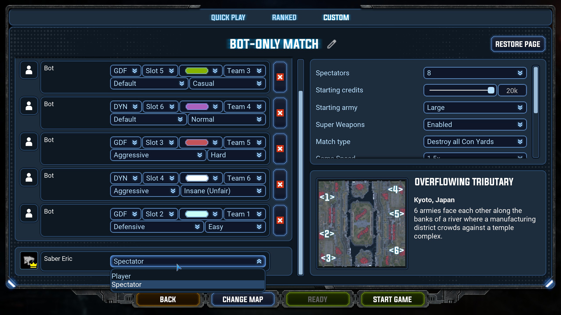 We’ve added the ability for players to launch ‘AI-bot only’ matches in Custom, with players able to watch using a Spectator slot. To set up a bot match, go to Multiplayer > Custom > Create Game, add AI bot players, and select Spectator.