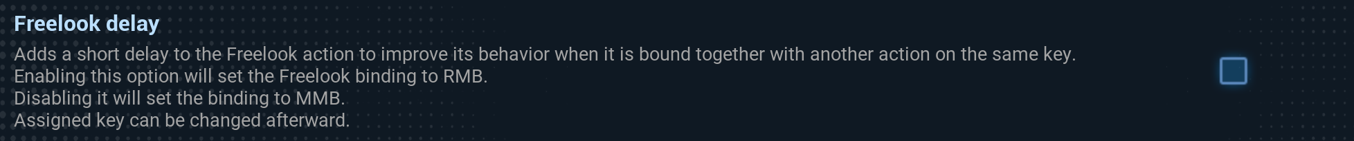 NOTE: As the name suggests, this checkbox introduces a small delay to prevent actions that use the same key from being triggered when players activate Freelook.