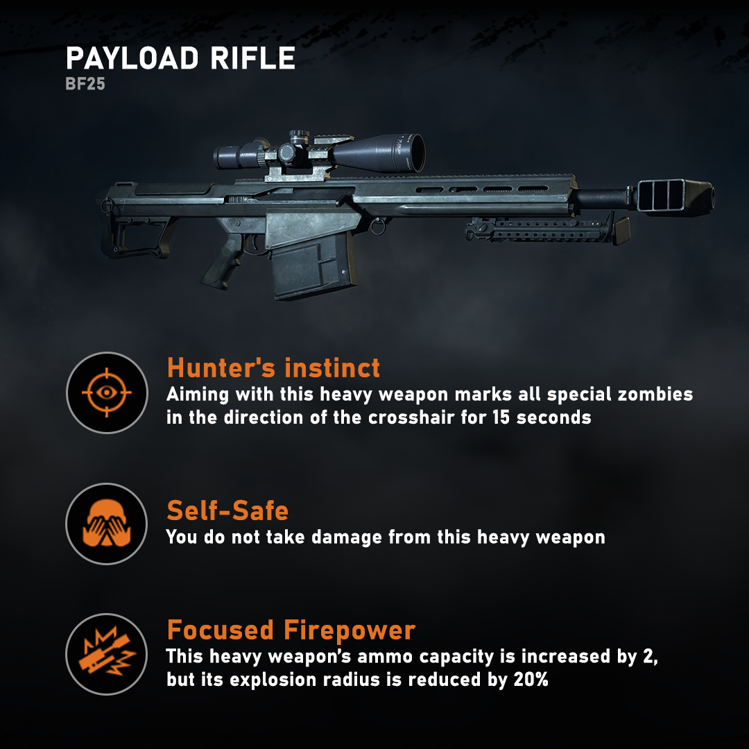 - Payload Rifle: Hunter’s Instinct, Self-Safe, and Focused Firepower.