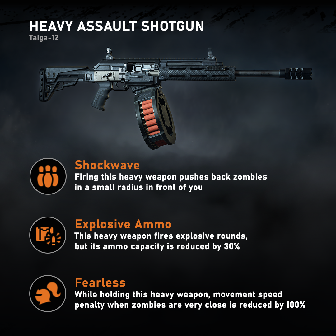 - Heavy Assault Shotgun: Shockwave, Explosive Ammo, and Fearless.
