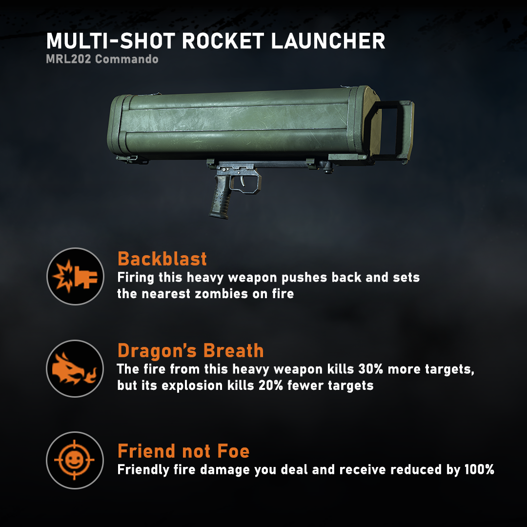 - Multi-Shot Rocket Launcher: Backblast, Dragon’s Breath, and Friend Not Foe.